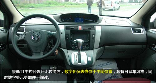 景逸TT的儀表盤位于中控的正中央,紅色的背光特別醒目,發(fā)動機(jī)轉(zhuǎn)速、車輛時速、油料情況、音響、空調(diào)控制等信息都能得到充分的顯示。中控臺上采用人機(jī)工程學(xué)原理設(shè)計(jì)的各種按鍵,簡單易用,處處體現(xiàn)了人性化關(guān)懷的設(shè)計(jì)元素。而且,“景逸TT”換擋桿也移至了中控臺上,不僅使用順手便利,更為駕駛員右側(cè)騰出了更大的活動空間。