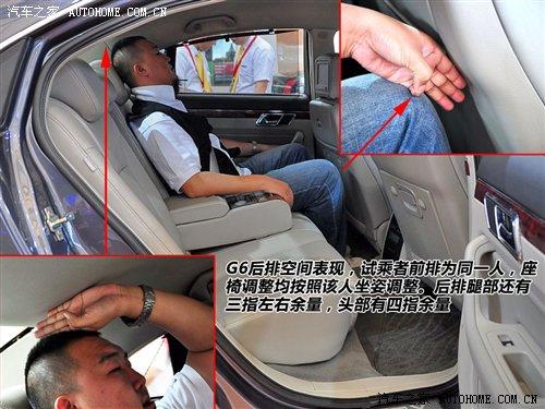 對(duì)于這種大尺寸車型最慣性的思路是感受它的空間。G6前排坐進(jìn)180cm以上乘客時(shí),頭部還有一拳以上余量。同一個(gè)人體驗(yàn)后排,腿部三指、頭部四指的空間余量只能說(shuō)比較一般。