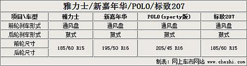 四款車型的前后剎車形式都是通風盤+蹄鼓式剎車,輪胎尺寸方面新建年華運動版和POLO Sporty兩款用到了更大的16寸輪胎并且寬度也更寬,非常符合這兩款車型突出運動性的定位。而雅力士和標致207的15寸車輪配合185輪胎寬度在同級別車型中也是中規(guī)中矩的配置。