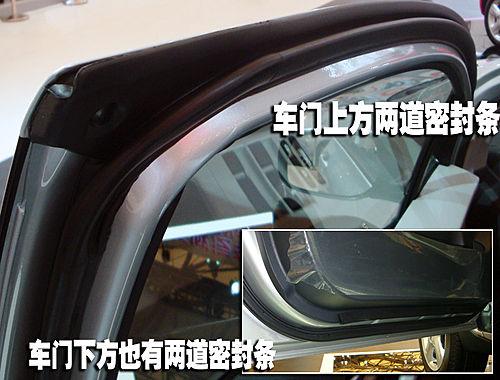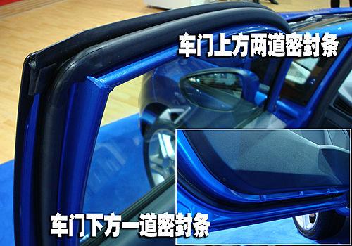 新嘉年華在車門上方提供了兩道密封、車門下方為一道密封,同樣的在車身門框的位置也提供了一圈密封條。不過記者仔細(xì)觀察卻發(fā)現(xiàn)新嘉年華的密封條質(zhì)地比較柔軟,并且這臺(tái)展車已經(jīng)出現(xiàn)了一些扭曲的現(xiàn)象。