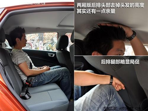 后排的乘坐空間相對來說就比較有限了,此時按照同一體驗人正常駕姿調整好前排座椅,后排腿部有一拳左右的余量。而后排頭部空間原本還有一點富裕,但是被體驗人豎立的頭發(fā)占了大半,于是圖片上我們只能看到非常小的余量了。以身高衡量的話,185cm的人坐在后排也可以,但只能正襟危坐了,除非前面換個瘦小型的司機,或者女司機。