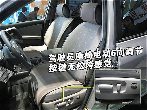 豐田國產(chǎn)RAV4整車座椅均采用真皮材料,駕駛席座椅前后、靠背角度、座椅高度為電動調(diào)節(jié)。各按鈕四周做工較細致,無任何松垮感覺。