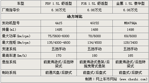 從基本參數(shù)來看,比亞迪F3R在車長及軸距在三款車中比較突出,相應(yīng)的內(nèi)部空間也將比較寬大些,而駿捷FRV稍次之但車身較高,頭部空間方面會比較好一些,而金鷹明顯要比他們小一號。