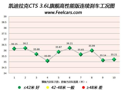 再來看看新CTS的連續(xù)10次剎車成績,最差成績?yōu)?6.21米,與最好成績差距僅為1.1米,且大部分成績均在36米以內,說明新CTS的剎車系統(tǒng)散熱效果非常好,始終保持在最佳的工作狀態(tài),沒有出現熱衰減現象。