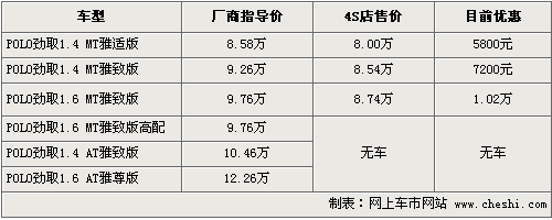 據(jù)銷售人員介紹,目前POLO勁情全系優(yōu)惠幅度從3900元-6000元不等,優(yōu)惠后售價(jià)從8.19萬(wàn)-10.56萬(wàn)元。同時(shí),近期推出的POLO運(yùn)動(dòng)款也受到消費(fèi)者喜愛,據(jù)銷售介紹,現(xiàn)車到店即買。運(yùn)動(dòng)款主要有藍(lán)色、黑色以及白色。目前POLO勁情以及運(yùn)動(dòng)版均已沒有現(xiàn)車供應(yīng),需預(yù)定,訂金為1萬(wàn),一個(gè)月時(shí)間才能提車。