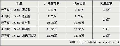 據(jù)廣州本田北京地區(qū)4S店銷售人員介紹,新飛度 1.5L炫酷運(yùn)動(dòng)版的優(yōu)惠金額為6000元。新飛度在售車型分為1.3L及1.5L共5個(gè)車型在售,1.3L手動(dòng)舒適版的優(yōu)惠金額為2000元,現(xiàn)售價(jià)為8.48萬(wàn)元。1.3L自動(dòng)舒適版的優(yōu)惠金額為3000元,現(xiàn)售價(jià)為9.38萬(wàn)元。1.5L豪華版的手動(dòng)和自動(dòng)車型經(jīng)4000元優(yōu)惠后,現(xiàn)售價(jià)分別為10.08萬(wàn)元和10.98萬(wàn)元,1.5L炫酷運(yùn)動(dòng)版的優(yōu)惠6000元,現(xiàn)售價(jià)為12.38萬(wàn)元。