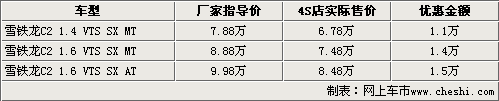 目前北京地區(qū)4S店主要賣的是C2運(yùn)動(dòng)版VTS車型,購(gòu)車的消費(fèi)者不僅可以享受到最高1.5萬(wàn)元的現(xiàn)金優(yōu)惠,而且還能得到商家隨車贈(zèng)送的部分車內(nèi)裝飾。目前C2運(yùn)動(dòng)版VTS主要有紅色、黑色等款,顏色和車型并不是很全,個(gè)別款需要預(yù)訂,其余車型均沒有現(xiàn)車銷售。