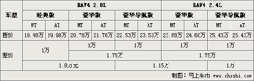 實現(xiàn)國產(chǎn)化后的RAV4分有2.0L與2.4L兩種排量并分別提供手動擋與自動擋車型,同時也因變速箱的差異,在RAV4全系的AT與MT車型間也就有了1萬元的差異。同樣,由于配置的不同,經(jīng)典版RAV4與豪華版間的差價為1.8萬元,豪華版與頂配豪華導(dǎo)航版車型也存在著1.75萬元的差價。而因搭載了不同排量的發(fā)動機,RAV4 2.0L豪華導(dǎo)航版和2.4的豪華版車型的差價為1.15萬元。