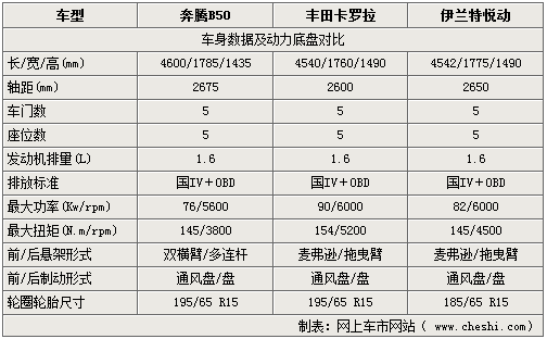 一汽奔騰新款轎車(chē)-B50即將在5月16日正式上市,作為向下擴(kuò)展的重要車(chē)型,它被一汽寄予了很大的期待。而在同級(jí)市場(chǎng)當(dāng)中還有很多1.6車(chē)型很具有競(jìng)爭(zhēng)力,比如日系的卡羅拉以及韓系的伊蘭特悅動(dòng)。作為國(guó)產(chǎn)車(chē)的奔騰B50到底與這些車(chē)型相比有那些優(yōu)勢(shì)呢?這里就將這款即將上市的新車(chē)與他們做一個(gè)詳細(xì)的配置對(duì)比,看看三款車(chē)型到底區(qū)別在那里。