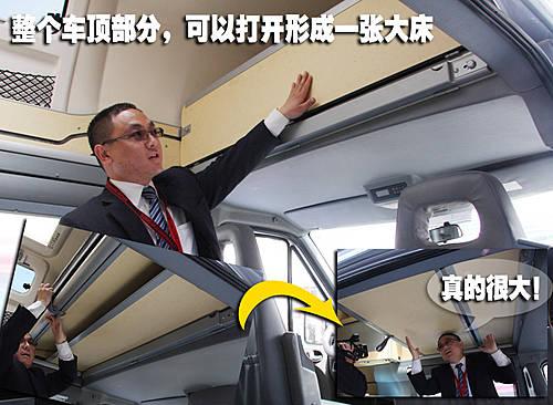 上面圖片中工作人員正在向記者演示隱藏在車頂?shù)碾p人床,在平時(shí)這張雙人床是隱藏的看不見的。此時(shí)在車輛中后部都可以擁有非常不錯(cuò)的縱向空間,即便身高在1.8米以上的乘員也不會(huì)感覺到頭頂?shù)膲阂帧?/p>