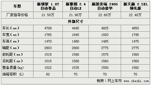 在車身尺寸方面,新雅閣雖然以4945mm的車長、1845mm的車寬、1590mm的前輪距和1580mm的后輪距位居四款車之首,但新領(lǐng)馭2803mm的超長軸距是其它三款車不可比擬的。由于整車軸距決定了車內(nèi)空間,所以新領(lǐng)馭的內(nèi)部空間較其它三款車更加寬裕。