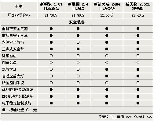 新領(lǐng)馭、新雅閣、新凱美瑞和新天籟作為中級車標桿,其在安全性能方面可謂是下足了功夫。前排安全氣囊、側(cè)安全氣囊及電子穩(wěn)定程序等均成為四款車的標準配置。而新凱美瑞和新天籟配備了自適應氙氣大燈,較其它兩款車提升了夜間行駛安全性。除此之外,新雅閣是四款同級車型中唯一沒有配備側(cè)氣簾的車型,讓人略感遺憾。