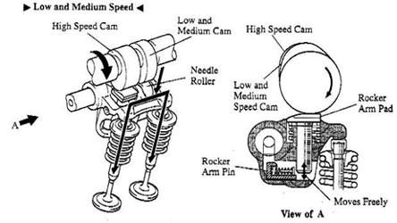 在可變氣門(mén)正時(shí)方面HONDA發(fā)動(dòng)機(jī)具有一定得領(lǐng)先性他的發(fā)動(dòng)機(jī)在低負(fù)荷運(yùn)轉(zhuǎn)情況下,小活塞在原位置上,三根搖臂分離,主凸輪和次凸輪分別推動(dòng)主搖臂和次搖臂,控制兩個(gè)進(jìn)氣門(mén)的開(kāi)閉,氣門(mén)升量較少,其情形好像普通的發(fā)動(dòng)機(jī)。雖然中間凸輪也推動(dòng)中間搖臂,但由于搖臂之間已分離,其它兩根搖臂不受它的控制,所以不會(huì)影響氣門(mén)的開(kāi)閉狀態(tài)。但當(dāng)發(fā)動(dòng)機(jī)達(dá)到某一個(gè)設(shè)定的高轉(zhuǎn)速(例如3500轉(zhuǎn)/分時(shí),本田S2000型跑車(chē)要達(dá)到5500轉(zhuǎn)/分),電腦即會(huì)指令電磁閥啟動(dòng)液壓系統(tǒng),推動(dòng)搖臂內(nèi)的小活塞,使三根搖臂鎖成一體,一起由中間凸輪驅(qū)動(dòng),由于中間凸輪比其它凸輪都高,升程大,所以進(jìn)氣門(mén)開(kāi)啟時(shí)間延長(zhǎng),升程也增大了。當(dāng)發(fā)動(dòng)機(jī)轉(zhuǎn)速降低到某一個(gè)設(shè)定的低轉(zhuǎn)速時(shí),搖臂內(nèi)的液壓也隨之降低,活塞在回位彈簧作用下退回原位,三根搖臂分開(kāi)。這樣一來(lái)就保證了您在低轉(zhuǎn)速時(shí)對(duì)油耗的控制,同時(shí)滿足你在發(fā)動(dòng)機(jī)處于高轉(zhuǎn)速下澎湃動(dòng)力輸出的需要。整個(gè)VTEC系統(tǒng)由發(fā)動(dòng)機(jī)主電腦(ECU)控制,ECU接收發(fā)動(dòng)機(jī)傳感器(包括轉(zhuǎn)速、進(jìn)氣壓力、車(chē)速、水溫等)的參數(shù)并進(jìn)行處理,輸出相應(yīng)的控制信號(hào),通過(guò)電磁閥調(diào)節(jié)搖臂活塞液壓系統(tǒng),從而使發(fā)動(dòng)機(jī)在不同的轉(zhuǎn)速下由不同的凸輪控制,影響進(jìn)氣門(mén)的開(kāi)度和時(shí)間。從而產(chǎn)生出您最希望獲取的動(dòng)力輸出。
