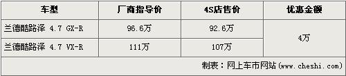 據(jù)經(jīng)銷商銷售人員介紹,豐田-蘭德酷路澤分為4.0L和4.7L兩種排量,由于4.0L車型的尾氣排放是歐III標準,沒有達到北京施行的歐IV標準,所以北京限賣,店內(nèi)沒有4.0L車型。4.7L車型分為GX-R版和VX-R版,目前購買蘭德酷路澤的消費者可以得到4萬元的優(yōu)惠。經(jīng)優(yōu)惠后,GX-R版售價降為了92.6萬元,VX-R版售價降到了107萬元。銷售人員還介紹,店內(nèi)沒有蘭德酷路澤現(xiàn)車,預購買者需交訂金1萬元,約等一個半月可提車。
