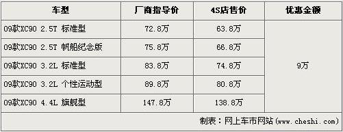 據(jù)沃爾沃經(jīng)銷商處銷售人員介紹,目前店內(nèi)的09款XC90車型全系都有9萬元的現(xiàn)金優(yōu)惠,并且此次優(yōu)惠活動截止到7月1日。經(jīng)優(yōu)惠后,2.5T標準型的售價跌破70萬元,僅售63.8萬元。2.5T 帆船紀念版經(jīng)9萬元優(yōu)惠后,售價從75.8萬元下降到了66.8萬元。兩款3.2L排量車型經(jīng)優(yōu)惠后售價降為74.8萬元及80.8萬元,頂配的4.4L旗艦車型售價降為了138.8萬元。銷售人員還介紹,XC90全系車型齊全,消費者挑選的空間較大。
