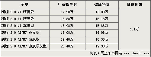 據(jù)4S店銷售人員介紹,目前購買凱旋可以優(yōu)惠1.1萬元,目前現(xiàn)車主要都是自動檔車型,主要有黑色、灰色可供選擇,而手動精英型和手動尊貴型則需要接受預(yù)訂,訂金為1000元,10個工作日可提車。