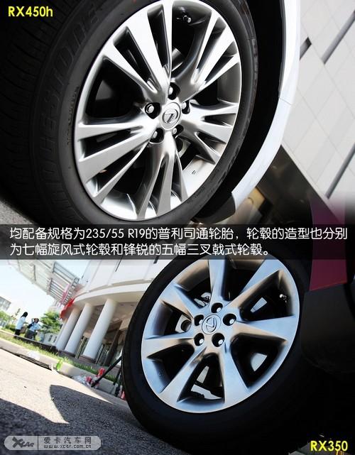 此外,新一代雷克薩斯RX350和RX450h均配備了規(guī)格為235/55 R19的普利司通輪胎,輪轂的造型也分別為七幅旋風(fēng)式輪轂和鋒銳的五幅三叉戟式輪轂,配合鑲嵌銀色鍍鉻飾條的內(nèi)凹式側(cè)裙,散發(fā)著亞光銀光澤的輪圈優(yōu)雅中帶著動(dòng)感。