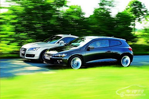 當(dāng)“尚酷”吹來時(shí),情況變了。這是一位血緣相同的異姓兄弟,同樣來自PQ35平臺(tái),同樣是轎跑車,一身平民裝束讓它看起來就像是一位起義領(lǐng)袖。雖然它登臺(tái)的目的不是要窩里反,可是這無疑給了我們這些成天琢磨汽車的好事者一個(gè)制造“爭(zhēng)端”的機(jī)會(huì)。于是TT 1.8TFSI和尚酷1.4TSI就被強(qiáng)迫上了擂臺(tái)。