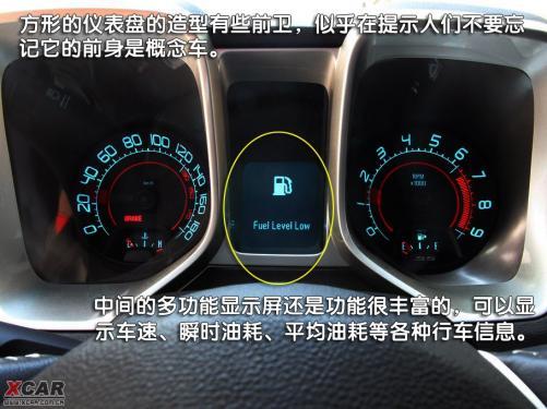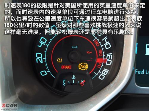 方形的儀表盤的造型有些前衛(wèi),似乎在提示人們不要忘記它的前身是概念車。中間的多功能顯示屏還是功能很豐富的,可以顯示車速、瞬時(shí)油耗、平均油耗等各種行車信息。在右側(cè)紅區(qū)表底9000轉(zhuǎn)的轉(zhuǎn)速表內(nèi),可以看到SS的小logo。左邊的時(shí)速表實(shí)在有些不夠讓人心動(dòng),為什么這么說呢,因?yàn)闀r(shí)速表的表底數(shù)值為180,難道Camaro SS這么強(qiáng)大超級(jí)跑車最高時(shí)速只能達(dá)到180公里/時(shí),不是之前官方說288公里/時(shí)嗎?據(jù)工作人員介紹,180的極限數(shù)值是針對(duì)美國(guó)所使用的英里速度單位來定的,而時(shí)速表內(nèi)的速度單位可通過行車電腦進(jìn)行變換,所以也導(dǎo)致Camaro SS在公里/時(shí)的速度單位下,很容易就超出表底180的最高車速,雖然對(duì)于那些喜歡挑戰(zhàn)極速的人來說180公里/時(shí)實(shí)在是毫無難度,但能夠如此輕松爆表還是非常具有樂趣的。