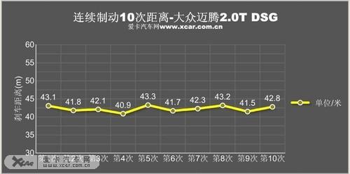 接下來(lái)的十次連續(xù)剎車(chē)測(cè)試中,新邁騰的剎車(chē)系統(tǒng)又表現(xiàn)出它穩(wěn)定的一面。高強(qiáng)度的連續(xù)測(cè)試,剎車(chē)系統(tǒng)依然可靠,并沒(méi)有出現(xiàn)明顯的熱衰退現(xiàn)象,最后兩次剎車(chē)也將成績(jī)保持在43米之內(nèi)。出現(xiàn)在第四次測(cè)試的最好剎車(chē)成績(jī)也鎖定在40.90米,良好的剎車(chē)品質(zhì)更讓人信賴(lài),相信在換上更寬的輪胎后,成績(jī)肯定會(huì)再次提高。