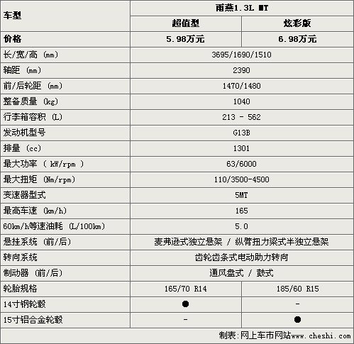 雨燕1.3L超值型的售價(jià)為5.98萬元,比炫彩版要便宜一萬元,在車身尺寸和動(dòng)力性能方面,這款新車都沒有任何變化。但雨燕1.3L超值型只配備了14寸鋼輪轂和14寸輪胎,而炫彩板則配備的是15寸鋁合金輪轂是15寸輪胎?偟膩碚f,雨燕超值型整車的性能基本上并沒有變化。