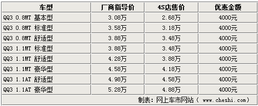 據(jù)銷售人員介紹,奇瑞QQ3系列車型比較齊全,只有1.1AMT車型現(xiàn)車較少。但目前QQ3全系都有一定的優(yōu)惠幅度,除現(xiàn)車較少的車型需要提前預(yù)訂以外,全系車型均可以優(yōu)惠4000元。