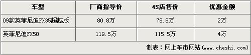 據(jù)英菲尼迪4s店銷售人員介紹,目前店內(nèi)銷售的FX系列有FX50和09款FX35兩款車型。英菲尼迪FX50近期出現(xiàn)了首次優(yōu)惠,降幅為4萬元,經(jīng)優(yōu)惠后售價從119.5萬元降到了115.5萬元。并且09新款的FX35超越版車型有2萬元優(yōu)惠,售價也降到了78.8萬元。