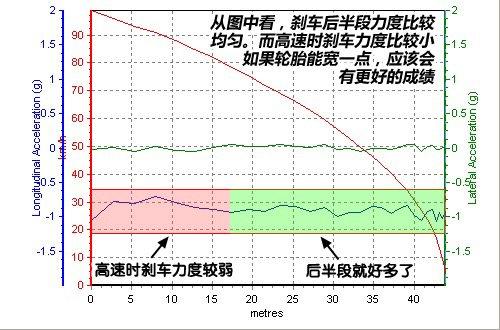 同樣在剎車測試時,205輪胎還是拖了后腿,抓地力實在有限。最終剎車的平均成績是44.4米,這已經(jīng)是能接受的極限了。如果換上大一號的輪胎,剎車成績能提高到42米左右就比較理想了。