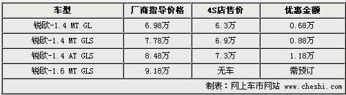 據(jù)4S店銷售人員介紹,目前銳歐全系優(yōu)惠幅度并不大,現(xiàn)售主要是1.4L排量車型,由于賽拉圖兩廂和三廂完全能夠滿足消費者的購車需要,所以幾乎沒有消費者選購1.6L排量的銳歐。1.4L三款車優(yōu)惠價格從0.68萬元到1.18萬元不等,同時店內(nèi)有銀色、紅色等現(xiàn)車可供選購,現(xiàn)車顏色較為齊全,消費者選擇的空間比較大。