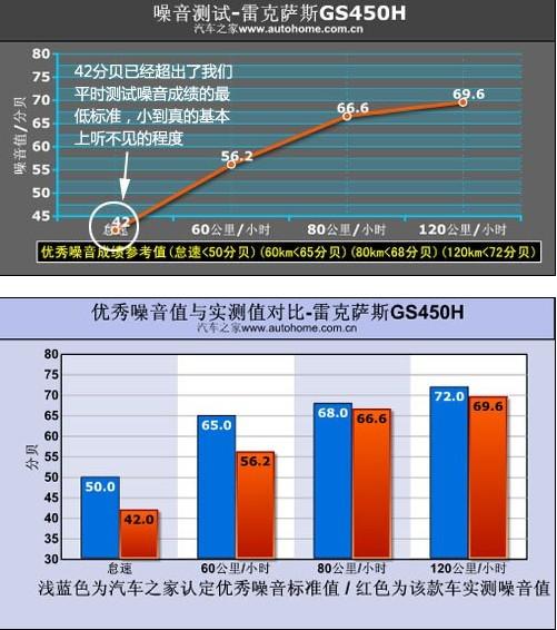 咱們再來說說GS450h的噪音環(huán)節(jié),怠速狀態(tài)下這款車的噪音值為42分貝,這個成績已經(jīng)比標(biāo)準(zhǔn)低了很多很多,實際坐在車內(nèi)基本上什么也聽不到,測試儀測出的這42分貝的聲音應(yīng)該是屬于人耳很難聽到的那種音頻。行駛中的噪音也非常理想,60km/h、80km/h、120km/h時速下的噪音成績分別為56.2分貝、66.6分貝、69.6分貝;靹榆囆妥畲蟮暮锰幘驮谟谒梢栽偃魏芜m當(dāng)?shù)臅r候?qū)⑵桶l(fā)動機關(guān)閉,只靠電動機就可驅(qū)動車輪,所以在這種狀態(tài)下行駛時主要的噪音來源是風(fēng)噪和胎噪。總體來講,GS450h的噪音抑制水平是相當(dāng)高的,而且我們能看的隔音棉這類的隔音設(shè)備也非常規(guī)整且厚實,但通過技術(shù)層面的改進(jìn)抑制噪音的做法我們必須表示肯定。