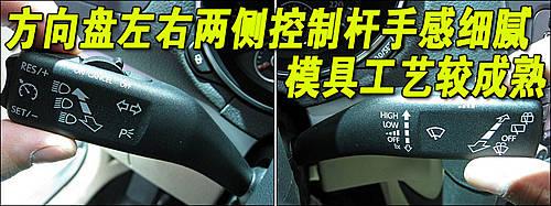 方向盤后方兩側(cè)的控制桿采用塑料材質(zhì),但是絲毫沒有手感欠佳的廉價感,模具也是相當考究,使用起來定位精準,手感厚實。