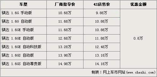 據(jù)東風日產4s店銷售人員介紹,目前東風日產騏達全系優(yōu)惠9000元。經(jīng)優(yōu)惠后,入門級的1.6G手動版售價下降到了9.88萬元,而全系最高配的1.6 GS自動尊貴版售價也降到了14.18萬元。銷售人員還介紹,目前店內沒有騏達現(xiàn)車,欲購買者需交2000元訂金約等1個月時間。