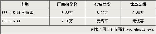 據比亞迪汽車北京地區(qū)4S店銷售人員介紹,目前北京在售的比亞迪F3R只有1.5L手動舒適版車型,并且廠商指導價也從6.08萬元回升到了6.28萬元。目前購買此車的消費者可以得到2800元的優(yōu)惠,經優(yōu)惠后售價降到了6萬元。