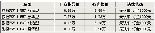 經(jīng)銷(xiāo)商透露,現(xiàn)在各店內(nèi)的FSV基本為展車(chē)或已被客戶(hù)預(yù)訂的車(chē)輛,基本沒(méi)有現(xiàn)車(chē)可以滿足消費(fèi)者的需要,消費(fèi)者如需購(gòu)買(mǎi)可以繳納1千元訂金后等待一個(gè)月左右即可提車(chē)。由于駿捷FSV為剛剛上市的新車(chē),所以店內(nèi)沒(méi)有任何形式的優(yōu)惠,請(qǐng)消費(fèi)者諒解。