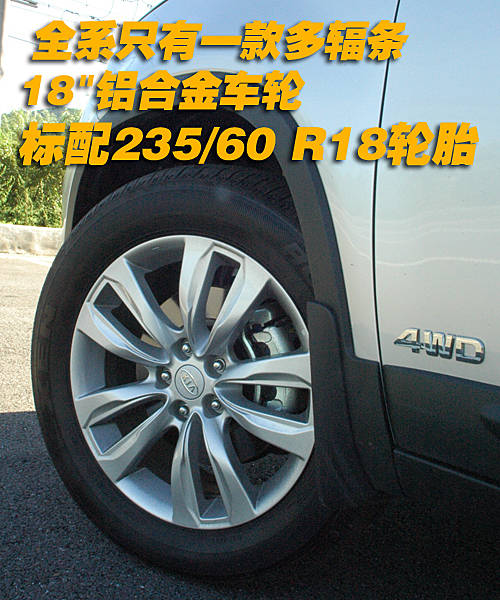 全新索蘭托配備了尺寸為235/60 R18輪胎。外觀輪轂采用了多幅輪轂,外觀切割的輪轂線條剛勁有力,運(yùn)動風(fēng)格非常強(qiáng)。在輪轂方面沒有選擇型,所以車型只有一款樣式。