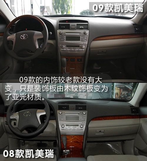 與外形只是細(xì)節(jié)小改相同,09款凱美瑞的內(nèi)飾也沒(méi)有給我們帶來(lái)太多新意。大面積的亞光飾板取代了原先的木紋裝飾,顯得更有檔次——避免再被人指責(zé)為塑料感強(qiáng)烈的尷尬。