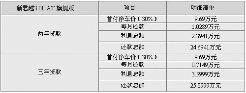 貸款詳解:新君越新上市不久,目前仍需要加價提車,現(xiàn)在實行的分期付款購車,分為兩年及三年付款兩類,買車的朋友可以根據(jù)自己的實際能力選擇貸款項目。首付款為凈車價的三成,也就是在9.69萬,當然編者所列的車型是新君越的最高配,按照比例來計算的話其它版本的車型首付款要低于9.69萬。