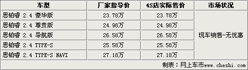 據(jù)東風本田4S店銷售人員介紹,目前思鉑睿全系車型均以到店,但車型顏色比較單一。思鉑睿全系提供了塔夫綢白、彩晶黑、鈦金銀、炫影藍、炫動紫五種外觀顏色,以及靜雅黃、靜逸黑兩種內(nèi)飾顏色供消費者選擇。TYPE-S車型還推出炫速紅專用色。售后保養(yǎng)方面制定整車三年十萬公里的保修政策,提供3個月/5000公里的易損件保修服務(wù)。