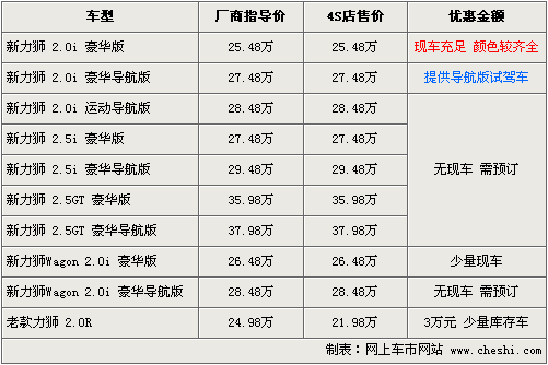 據(jù)斯巴魯北京地區(qū)4S店銷售人員介紹:新款力獅已經(jīng)到店,目前全部為2.0i豪華版及Wagon豪華版,2.0i現(xiàn)車比較充足,顏色有藍(lán)色、白色、銀色、黑色、灰色可選。另外還提供了2.0i導(dǎo)航版為試駕車,而老款力獅還有少量庫存車,現(xiàn)優(yōu)惠3萬元。