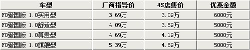 據(jù)比亞迪汽車4S店銷售人員介紹,比亞迪F0愛國(guó)版igo系列車型的現(xiàn)車并不是很齊全,實(shí)用型和舒適型都有現(xiàn)車,尊貴型和旗艦型則需要預(yù)訂,大概10-15天即可提車。而目前1.0L實(shí)用型和舒適型都有現(xiàn)車,其中實(shí)用型可以優(yōu)惠6000元,優(yōu)惠后售價(jià)已經(jīng)接近3萬(wàn);而其他車型只可以優(yōu)惠5000元現(xiàn)金。