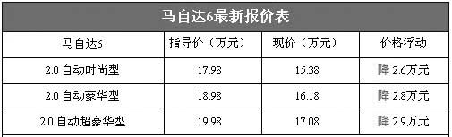 馬自達(dá)6是一款非常經(jīng)典的車型,現(xiàn)在更是憑借著突出的性價(jià)比持續(xù)熱銷。昨日,我們從北京地區(qū)的一些一汽馬自達(dá)汽車綜合經(jīng)銷商處了解到,近期馬自達(dá)6的價(jià)格穩(wěn)定,降幅在2.8萬元左右,其中馬自達(dá)6 2.0自動(dòng)時(shí)尚型目前的售價(jià)為15.38萬元,性價(jià)比非常不錯(cuò)。以下是馬自達(dá)6最新詳細(xì)報(bào)價(jià)表: