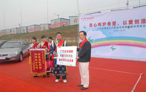 中新網(wǎng)10月29日電 日前,“用心呵護(hù)希望,以愛(ài)創(chuàng)造明天——廣汽本田向北川職業(yè)中學(xué)捐贈(zèng)教學(xué)用車儀式”在北川職業(yè)中學(xué)綿陽(yáng)九洲板房校區(qū)舉行。廣汽本田汽車有限公司向北川職業(yè)中學(xué)捐贈(zèng)了一批價(jià)值100萬(wàn)元的教學(xué)用車及設(shè)備,用于該校汽車修理專業(yè)的教學(xué),為災(zāi)區(qū)學(xué);謴(fù)正常教學(xué)提供幫助。在捐贈(zèng)儀式結(jié)束后,來(lái)自廣汽本田的講師還為汽修專業(yè)的同學(xué)們上了一堂生動(dòng)的汽車專業(yè)課。