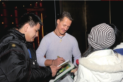 昨晚,參加世界車王爭(zhēng)霸賽的舒馬赫抵京,入住北辰洲際酒店,引來(lái)車迷的追捧。
