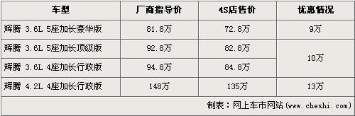 據(jù)北京進(jìn)口大眾經(jīng)銷店銷售人員介紹,目前輝騰3.6L 5座加長(zhǎng)豪華版有9萬(wàn)元的現(xiàn)金優(yōu)惠,經(jīng)優(yōu)惠后3.6L 5座加長(zhǎng)豪華版的售價(jià)降到了72.8萬(wàn)元。排量稍大的4.2L 4座加長(zhǎng)行政版有13萬(wàn)元的優(yōu)惠,經(jīng)優(yōu)惠后售價(jià)從148萬(wàn)元下降到了135萬(wàn)元。銷售人員還介紹,4.2L輝騰沒(méi)有現(xiàn)車,欲購(gòu)買(mǎi)的消費(fèi)者需交訂金10萬(wàn)元預(yù)訂。