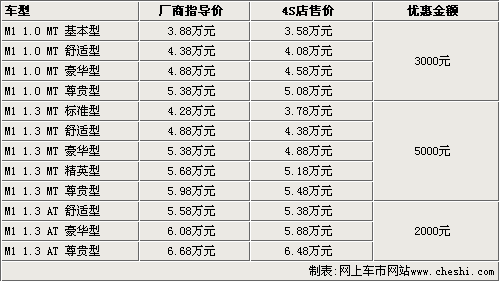 據(jù)瑞麒4S店銷售人員介紹,目前M1 1.0L車型和1.3L手動車型現(xiàn)車都比較齊全,其中1.0L車型可以優(yōu)惠3000元,1.3L手動擋車型可以優(yōu)惠5000元。另外,該銷售人員介紹,M1 1.3L自動擋豪華型已經(jīng)到店,其他車型將在本周抵達4S店,而且自動擋車型現(xiàn)在能優(yōu)惠2000元。