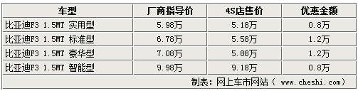 作為比亞迪汽車旗下的重點(diǎn)產(chǎn)品,比亞迪F3在今年又推出了智能白金版,新款車型增加了無鑰匙系統(tǒng)、智能娛樂通訊系統(tǒng)等高端配置,使這款自主品牌家用轎車的競(jìng)爭(zhēng)力更加突出。網(wǎng)上車市網(wǎng)站了解到,雖然比亞迪F3智能白金版上市時(shí)間不長(zhǎng),但目前優(yōu)惠幅度有所提升,經(jīng)銷商處全系最高可給出1.2萬的優(yōu)惠。詳情如下: