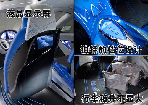 內(nèi)飾方面大量采用了藍(lán)色光,車內(nèi)檔位部分采用了類似盾形的設(shè)計(jì),風(fēng)格大膽,超乎人的想象。在駕駛座后排還安裝有液晶顯示屏幕,同時時尚的行李箱也透出新穎的概念設(shè)計(jì)。