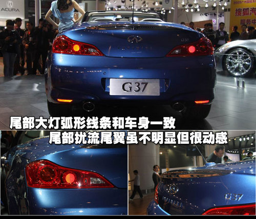 G37敞篷版的尾部大燈設計與前大燈交相呼應,同時尾部的小型擾流尾翼也為尾部增添了動感色彩。車身簡潔的線條個性很鮮明,流暢中蘊含著無限動能與速度感,讓人過目難忘。