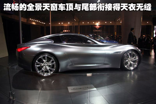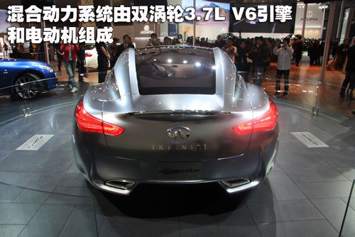圍著這輛英菲尼迪斥巨資打造的GT跑車轉(zhuǎn)上一圈,你會驚嘆它是如此的低矮,如此的修長。環(huán)繞整個車身的腰線,華麗的曲面,將流暢的全景天窗車頂與尾部銜接得天衣無縫。 它那長得有些夸張的引擎蓋,完全是為了承載一部動力強勁到足以與法拉利Scuderia叫板的混合動力系統(tǒng)。一臺標(biāo)準(zhǔn)的3.7升V6自然吸氣汽油機,加裝了雙渦輪,最大功率躥升至324千瓦。當(dāng)并聯(lián)的混合動力系統(tǒng)滿負(fù)荷工作時,Essence概念車可以獲得442千瓦的驚人動力。