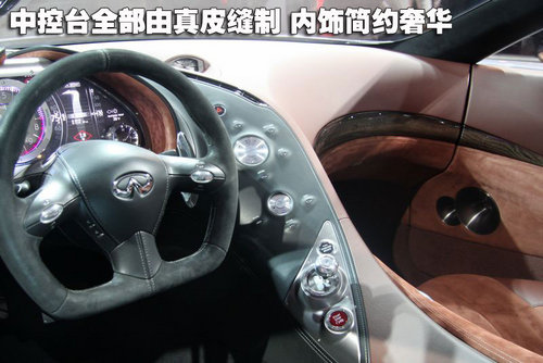 內(nèi)飾設(shè)計由英菲尼迪和奢侈品牌LV聯(lián)合完成,風(fēng)格抽象,采用顛覆傳統(tǒng)的不對稱式設(shè)計,黑色駕駛席與紅色客席對比鮮明,中控臺完全集中在駕駛席一側(cè)。內(nèi)飾材質(zhì)以真皮和實木為主,并用大量鋁制配件點綴,突顯運動氣質(zhì)。